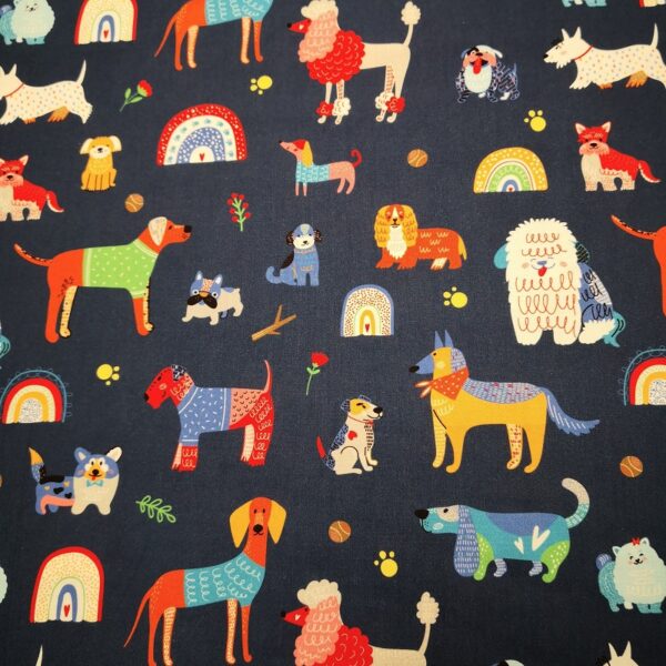 Perritos de colores sobre fondo azul marino. Con esta tela puedes confeccionar mochilas, bolsitas de almuerzo, fundas para tu ordenador…Y también complementos para tu mascota.