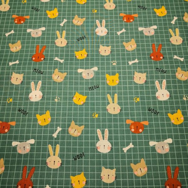 Estampado de estilo nórdico de cabecitas de animalitos sobre fondo verde. Con esta tela puedes confeccionar cualquier proyecto infantil como una mochila, un cojín o una funda nórdica.