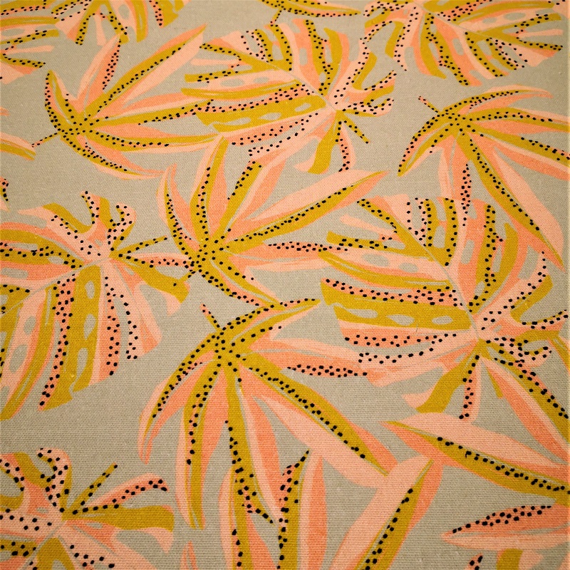 Estampado de hojas de colores pastel, natural suave y resistente. con ella puedes confeccionar cojines, bolsas, mochilas y otros complementos.