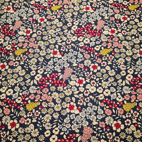 Pequeñas florecitas sobre fondo azul marino, los tonos rosas y el amarillo dan un toque alegre. Utiliza esta tela para cualquier proyecto de costura, sobre todo accesorios, nunca te cansarás de ella.