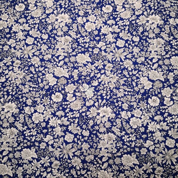 Clásico estampado de flores sobre un moderno fondo azul cobalto. Tela de patchwork diseñada por la casa Liberty que también puedes utilizar para confección o para tus proyectos de costura creativa.