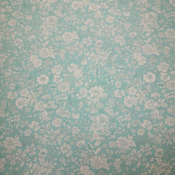 Clásico estampado de flores  sobre un moderno fondo turquesa. Tela de patchwork diseñada por la casa Liberty que también puedes utilizar para confección o para tus proyectos de costura creativa.