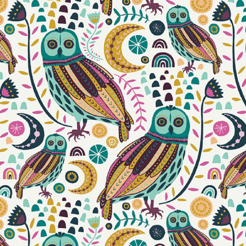 Esta tela pertenece a la colección Lugu de vivos colores en la que las fases de la Luna, lechuzas de colores y pequeñas ciervas con coronas forman parte del mágico universo nocturno del bosque. Para tus proyectos de patchwork, esta tela también es ideal para confeccionar mochilas y todo tipo de accesorios textiles.