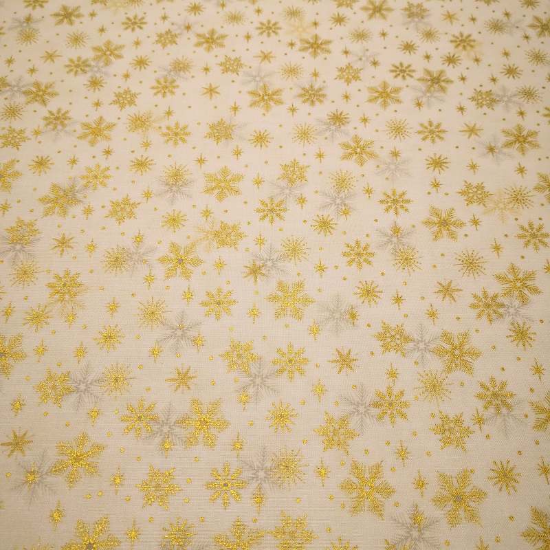 Estrellas diseñadas según los patrones de los copos de nieve, en tono dorado con pequeños toques plateados. Utiliza esta tela para cualquier proyecto navideño, su estampado es perfecto si te gusta decorar la Navidad con tonos neutros o poco contrastados. Puedes confeccionar un camino de mesa, bajoplatos o las estrellas y bolas que decoran tu abeto.