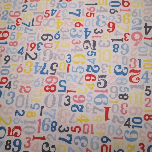 Tela con números multicolores de trazo desigual, parece que está pintada a mano. De tonos suaves. El estampado de números es un clásico en proyectos infantiles.
