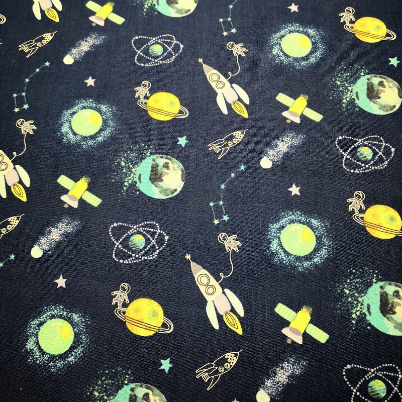 Cohetes, planetas y astronautas que estimularán la imaginación de cualquier niña o niño. Tela de patchwork, puedes confeccionar una colcha, una mochila o una bolsita para el almuerzo.