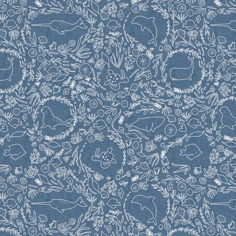 Tela ligera de color vaquero inspirada en el fondo del mar, con motivos de animales y plantas marinas. Ideal para prendas como vestidos, blusas o faldas, para el día a día o ir a la playa.